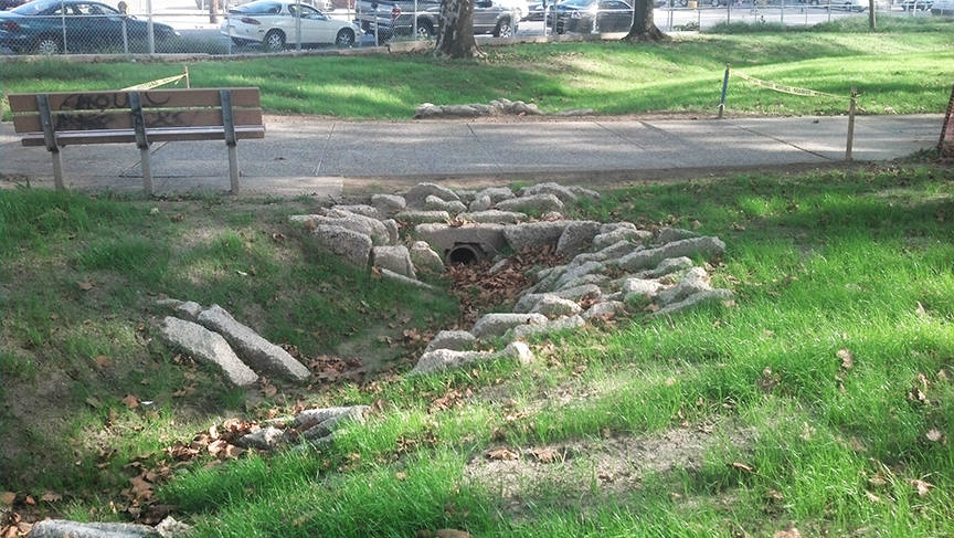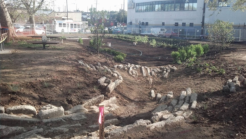 My role as designer for WRT and as private consultant for Construction Administration included analysis, design, documentation and specifications for the reuse of concrete demolition materials from the site and architectural salvage stone from Philadelphia. The reused materials provide erosion control at the outfalls where stormwater enters the park through pipes from modified street inlets. Additionally, the hard materials provide erosion protection around the forebay and at its overflow. The forebay is where stormwater temporarily pools so that suspended sediments fall to the bottom. Reused concrete and salvaged stone are also used at the bioretention area overflow, where excess stormwater enters a device that connects Womrath Park’s green infrastructure system back to the city’s traditional combined sewer. |
