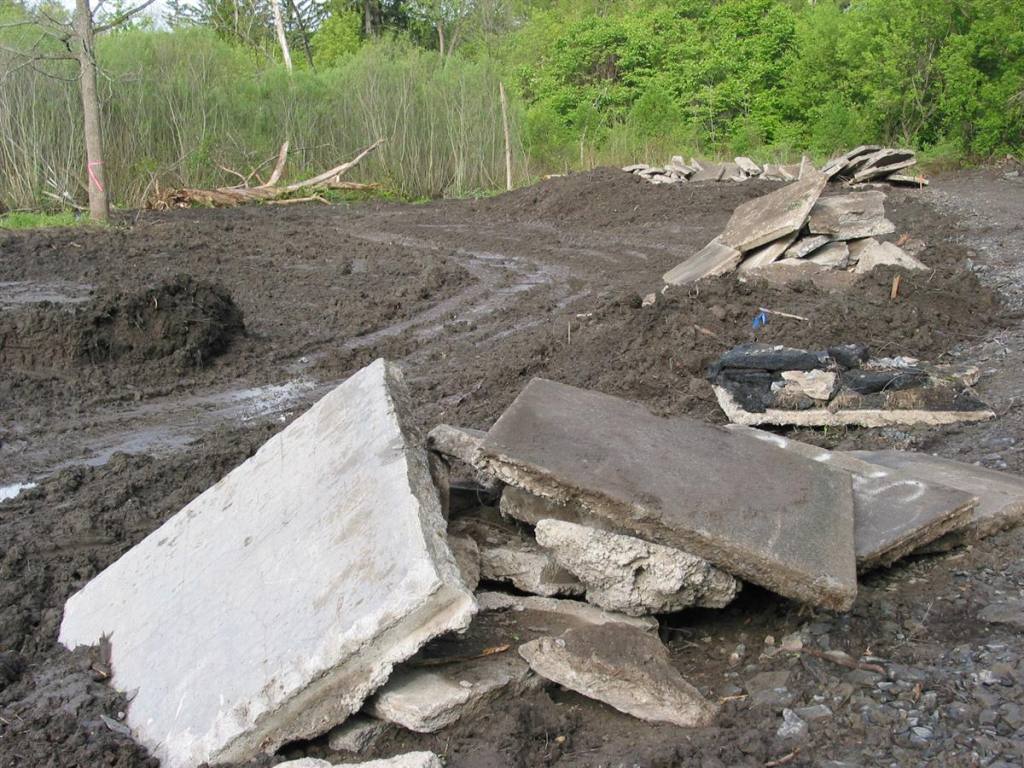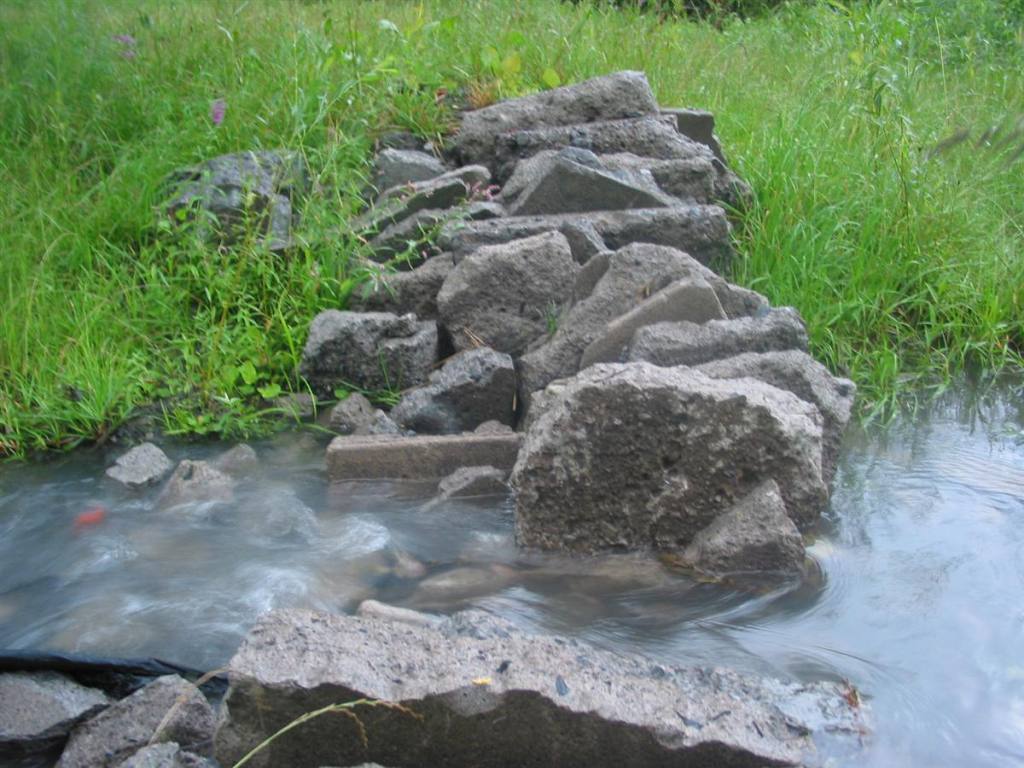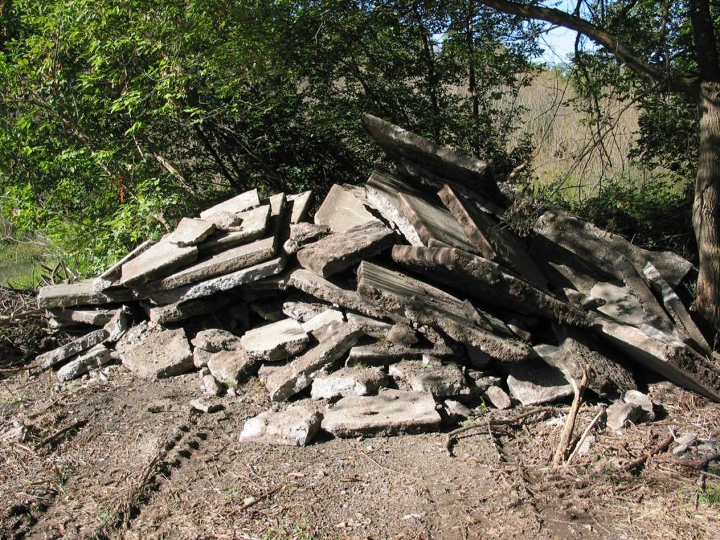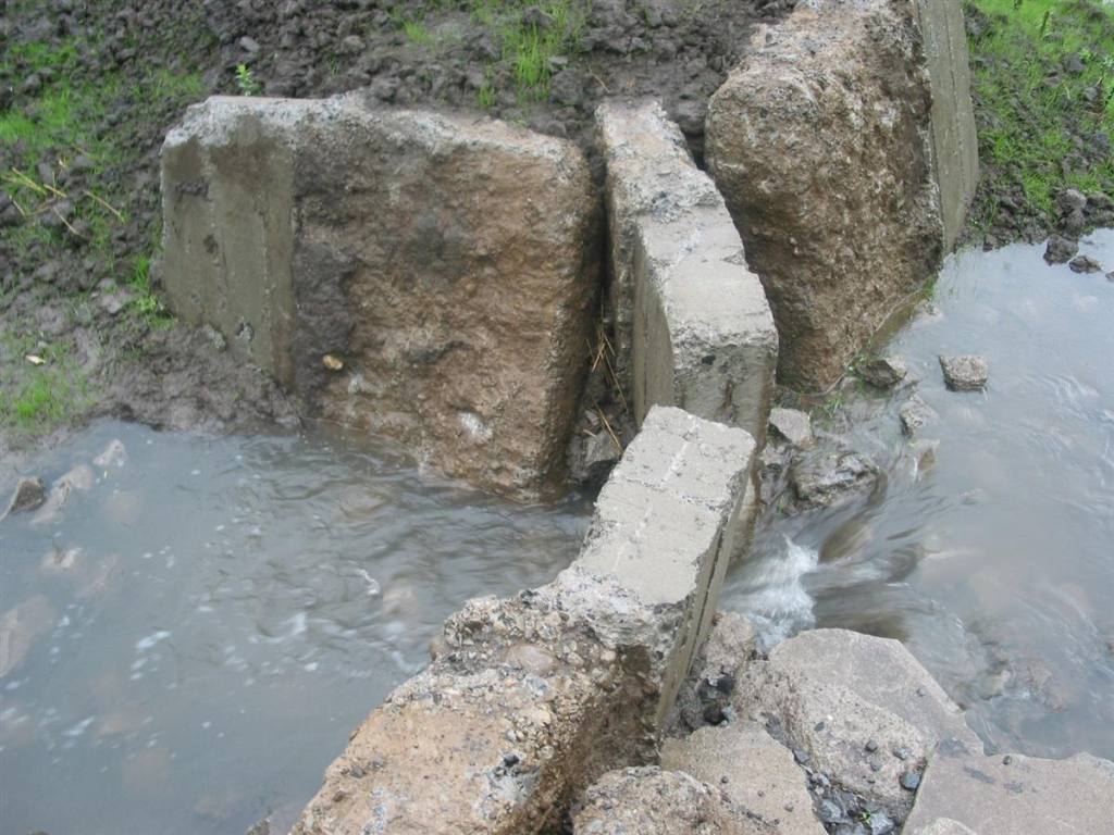 | Pile of demolished sidewalks | | Demolished sidewalks distributed to weir sites | | Weir Three at work |
